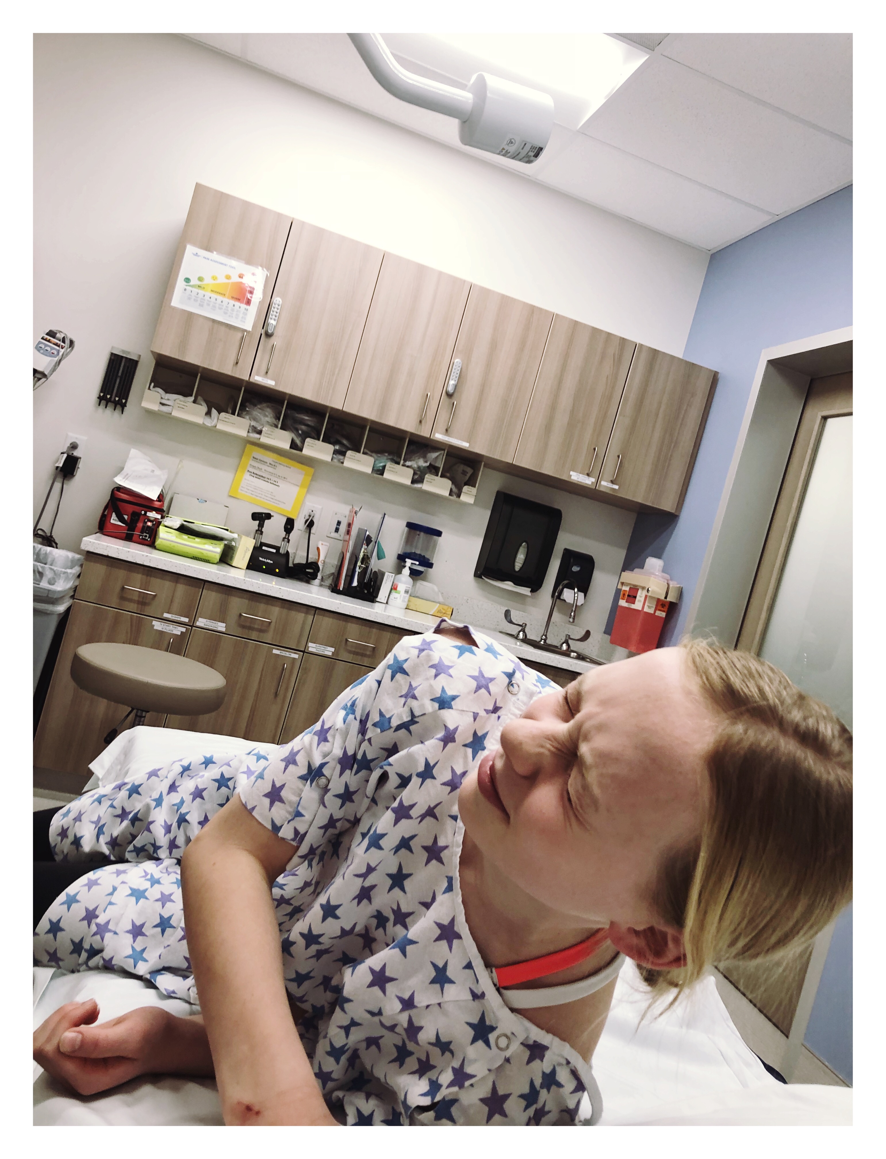 She was going for a whip and landed wrong, slamming into the tumbling mat and had her knees hit her chest near her sternum. With a lump on her chest and tingling in her hands, we decided to take her to instacare. She sat up straight in her appointment because that was the most comfortable position, laying down was the worst. After an exam and chest x-ray, she was directed to take a week off from tumbling.