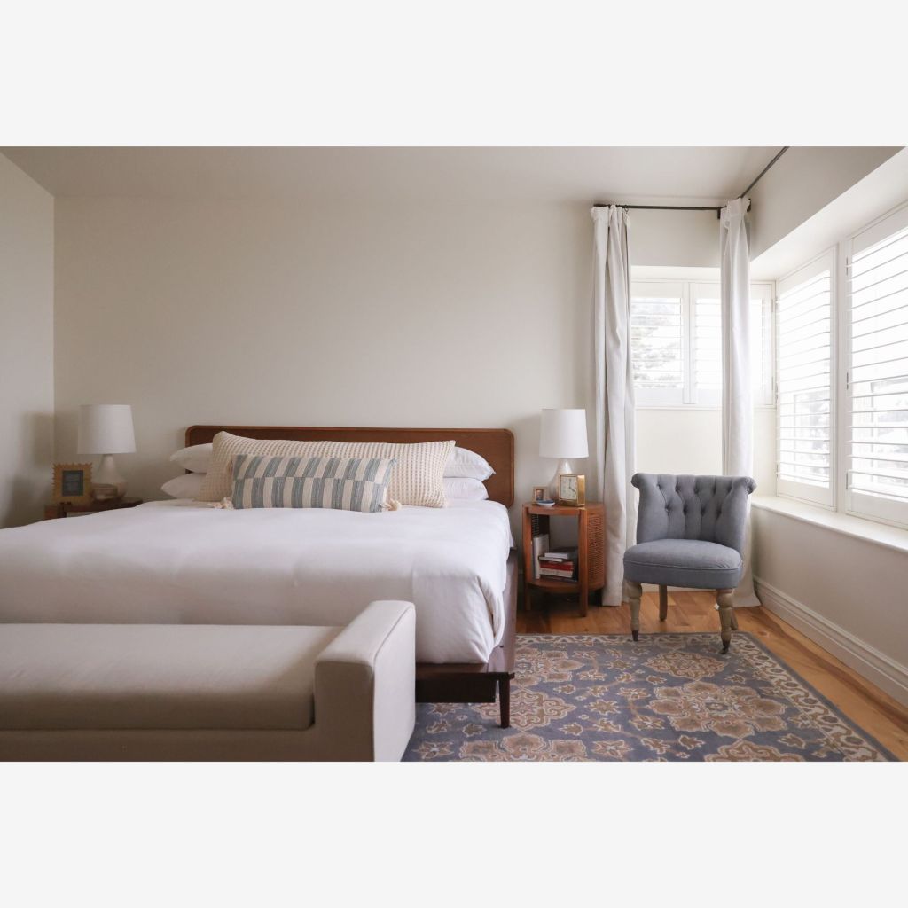 The primary bedroom: we wanted it to feel calm and peaceful. With the stresses of everyday life, it feels like a luxury to have a place to end the day with calm and serenity. To create this, we kept the colors neutral and soft. We also added texture with materials like wood (headboard, floor and night stands), rattan (nightstands), and textured throw pillows. We kept the decor very minimal, even on the walls.
