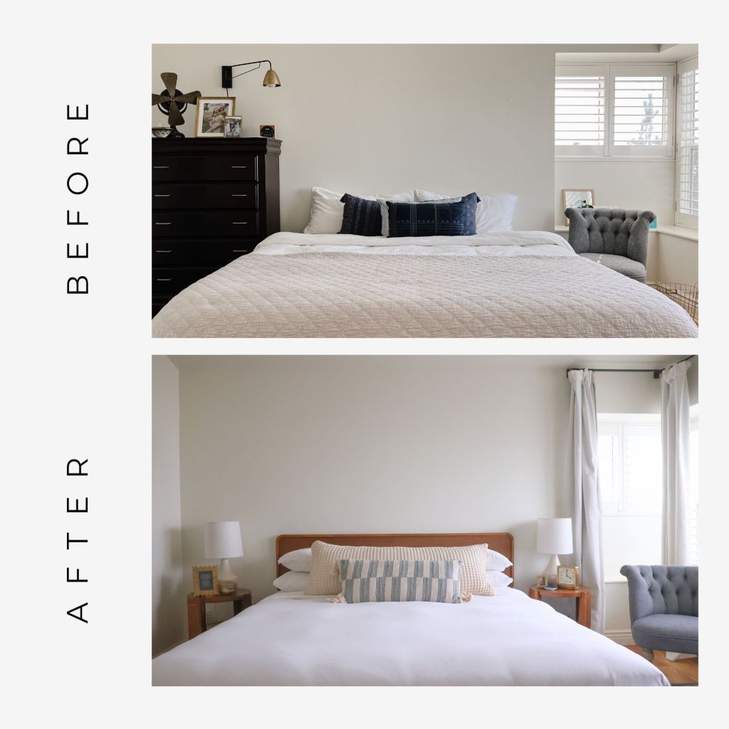 When we first moved in we had a heavy sleigh bed frame that matched the dressers. When we removed the dressers we were able to switch up the bedframe. We found the platform of the frame second-hand but wanted a headboard to frame the space. (linked below)